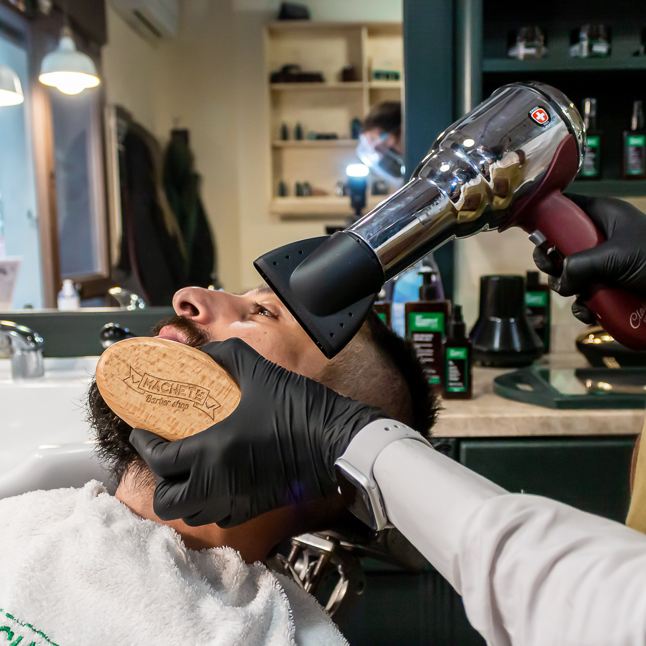 L’atmosfera che ti accoglie è quella inconfondibile dei Machete Barber, uno stile unico d’altri tempi che rievoca gli arredi e l’appeal dei barbieri americani old-school.